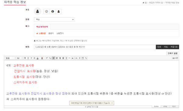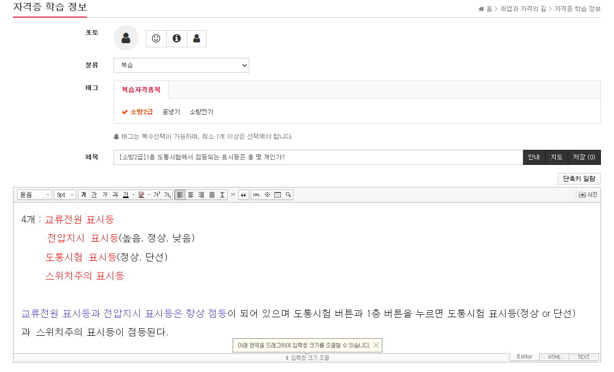 3. [제목] 란에 문제를 적어주시고 문제 맨 앞에 종목명을 꼭 적어 주세요. (예: [소방2급], [공냉기], [소방전기] 등...)